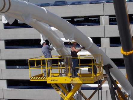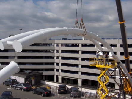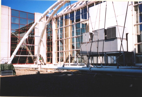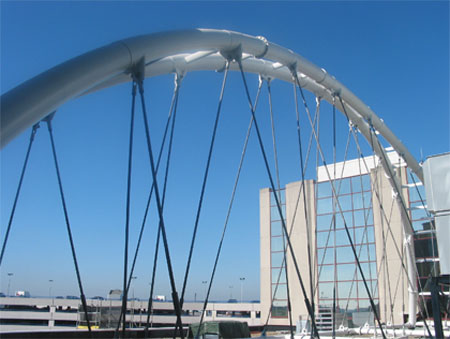 Ontwerp en uitvoering van de boogbrug op het dak van het hotel (stalen frame constructie).